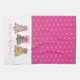 This cute Christmas holiday party kitchen dish towel features three preppy Christmas trees in girly shades of pink and green with fun bows at the top with a background of girly pink and white polka dots. Fun for your holiday party decor.