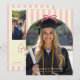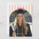 A soft and feminine graduation design featuring classic pink stripes, a delicate bow accent, and a clean photo-focused layout. The combination of structured preppy elements with subtle coquette styling creates a look that feels both playful and elevated.