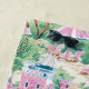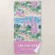 This beach towel design features a preppy beach scene with pink sand castles. You can personalise with your name and location.
