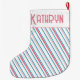 A fun holiday stocking for the modern girl. These stockings include a whimsical pink and blue stripe design with a bold font for the name.
