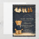 A charming preppy baby shower design featuring a sweet teddy bear dressed in a classic green plaid jacket and bow tie. Above the bear, a delicate clothesline displays tiny baby clothes and shoes, creating a nostalgic storybook nursery scene. The deep navy background and subtle tartan border add a refined, vintage-inspired touch that feels both elegant and playful. Perfect for a stylish baby shower celebration with a classic preppy aesthetic.
