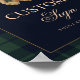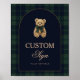 A charming baby shower table sign featuring classic green and navy plaid with a cuddly teddy bear. A simple, timeless detail for an elegant celebration.