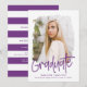 Trendy graduation party invitations featuring the graduate's photo inside of a textured mask frame with "Graduate" in a purple handwritten script. Personalise the front of the photo graduation party invites by adding the graduate's name, school name, and graduation year. The invite reverses to display your graduation party details with a purple and white stripe pattern.