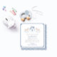 This classic baby shower invitation design features a simple monogram crest with ribbon bow trim flanked on either side by a wooden rocking horse. All watercolor elements were painted by me onto 100% cotton paper and scanned into digital form.