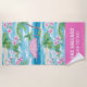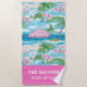 This can beach towel design features a preppy beach print with a pink umbrella, palm trees and hibiscus flowers. You can personalise with your Family name or your Air BNB name. These towels are perfect for a beach vacation home or rental.