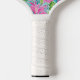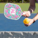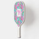 This pickleball paddle design features a preppy hibiscus print. You can personalise with your name and initial. The back has coordinating pink and white stripes.