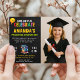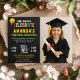 This invitation is ideal for preschool, pre-k, or kindergarten graduation parties. The left side of the design includes cheerful classroom graphics like an apple with glasses, colourful books, and a happy lightbulb – all set against a chalkboard-style background. On the right, there's space for a personalised photo of your child in their graduation outfit.
