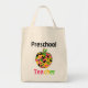 A bag for teachers featuring a design of an apple covered in yellow, black, green, and pink paint splatters. Matching spraypaint text reads "preschool teacher." Bag available in other colours and styles including jumbo, impulse, and budget totes.