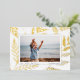 Elegant and understated holiday photo card frames a single horizontal or landscape-oriented photo with a white border, on a background of gold foil botanical leaves and foliage. Personalize with your custom holiday greeting (shown with "Merry Christmas"), your family name, and the year.