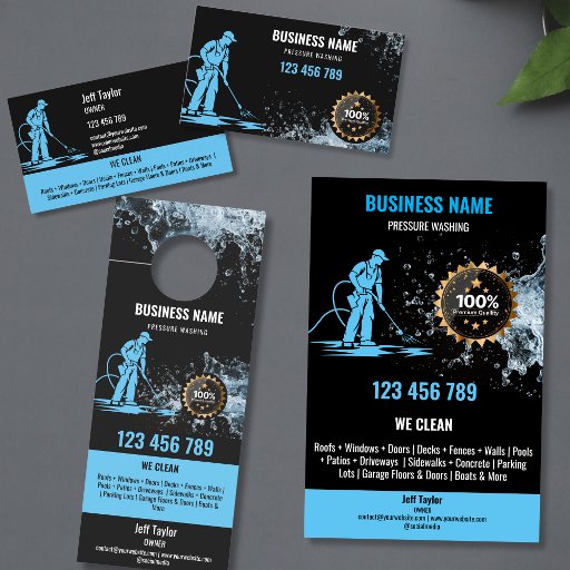 Professional commercial and residential power washing business card design - blue pressure washing gun for your pressure washing services