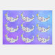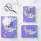 This set of wrapping paper sheets have pretty abstract white crescent moons with faces decorated with bright colourful geometric shapes including triangles, circles and scrolls in colours of blue, purple, and yellow on a purple and blue sky background with stars.