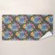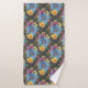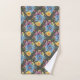 Pretty bath towel set design has large painted primary blue flowers with smaller ones in marigold yellow, purple and pink, all on a charcoal grey background giving it a dark and elegant look.