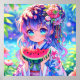 Pretty watercolor ai art depicting a cute anime girl with purple hair eating watermelon on a hot summer day.