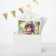 Birthday party favours. Anime girl with long brown hair, pink bows in her hair, holding a orange and white kitten wearing a birthday hat.