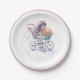 Cute baby shower paper plates, with graphics of a pretty baby buggy with flowers and bows and a pink rim, around the edge. Personalise the pink custom text to suit your needs.