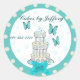Elegant teal and tan design with a wedding cake and a pale teal bow, on a round sticker. Customise the text to meet your needs. Perfect for use in your business.