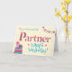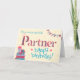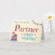 A pretty Birthday Card for a very special Partner, with a pile of Birthday gifts, Bunting and Flowers. The word, 'Partner' is in patterned lettering and Happy Birthday is in Turquoise Blue, all on a cream background, with hearts scattered around. A digital design by Judy Adamson for the Granny Prints Collection.