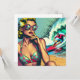 Pretty retro blonde pinup woman sitting on beach with sunglasses watching a hot surfer dude in vintage colours in a pop art comic style.
