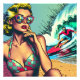Pretty retro blonde pinup woman sitting on beach with sunglasses watching a hot surfer dude in vintage colours in a pop art comic style.