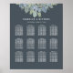 Lovely and soft colour scheme in vintage shades of blue-grey, olive green and dusty purples on a pretty background in a deep grey blue hue. Original illustration of floral blooms adorn the top of this wedding seating chart poster to be displayed at your reception. Perfect for any spring, summer, outdoor, evening or garden wedding and coordinates beautifully with the other pieces in this design suite.