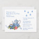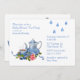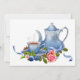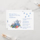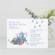 Pretty baby shower tea party invitation, done in a white matte card stock, with lovely graphics of a blue and white polka dot tea set, with rose, blue berries and raindrops. Personalise the blue text for your upcoming shower. Also lovely for bridal showers.