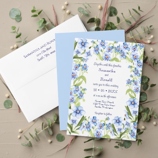 A wedding invitation featuring blue watercolor forget-me-not flowers.