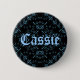 Beautiful intricate design in black and blue on a button that says "Cassie" on it. You can replace this name with your own.