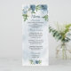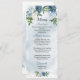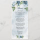 beautiful blue and white flowers and green leaves romantic wedding menu.