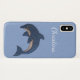 This iPhone X phone case is light blue with a pretty blue and white ocean dolphin with a faux sparkle texture in a jumping position. Customise your name with the template.