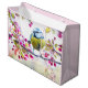 Gift bag with an amazing photograph of the cutest little bird perched on a branch covered in pink blossoms and green leaves. The bird has a blue head and yellow body with a very sweet face. Adorable.