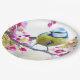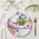 Paper plates with an amazing photograph of the cutest little bird perched on a branch covered in pink blossoms and green leaves. The bird has a blue head and yellow body with a very sweet face. Adorable.