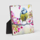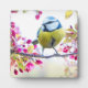 A plaque with an amazing photograph of the cutest little bird perched on a branch covered in pink blossoms and green leaves. The bird has a blue head and yellow body with a very sweet face. Adorable.