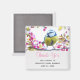 A favour magnet with an amazing photograph of the cutest little bird perched on a branch covered in pink blossoms and green leaves. The bird has a blue head and yellow body with a very sweet face. Adorable.