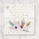 Beautiful Boho watercolor illustration features flowers and feathers on white with gold arrows background. Customise with wedding couple's details