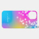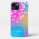 Colourful gradient blend shades of aquamarine pink and bright yellow, with falling bokeh sparkles in white. Personalise with your name or initials in white font lettering.