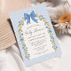 This beautiful baby shower invitation features hand drawn wildflowers in shades of baby blue and yellow, along with a cute satin bow over an arch shaped frame. The back contains a matching bows pattern. Perfect for the mama expecting a little boy!