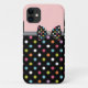 Pink iPhone 5 cases with a pretty bow and colourful polka dots, with pink background. Designed for women or girls who love polka dot patterns, this great cell phone cover let's you cover your iPhone in style and colours include pink, white, black, purple, green, blue and green.
