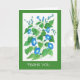 A pretty floral Thank You greeting card with bright blue Morning Glory flowers on a white background with a matching green border. The design is a hand-painted watercolour by Judy Adamson and you can personalise the inside message.