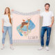 A personalised blanket with a beautiful brown doe with white spots on her fur. A cute bird sitting on the deer's back. An elegant flower arrangement composed of watercolor roses and light green leaves beneath her feet. A blue polka dot border with a peach coloured background. Darling and adorable design.
