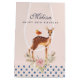 A personalised gift bag with a beautiful brown doe with white spots on her fur. A cute bird sitting on the deer's back. An elegant flower arrangement composed of watercolor roses and light green leaves. A blue polka dot border with a peach coloured background along the bottom. Darling and adorable design.