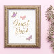 This pretty guest book baby shower sign features a simple design of fluttering butterflies around stylish typography. A colour scheme of pastel pink, purple, and faux gold foil create an elegant look.