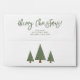 Pretty Christmas envelopes with green pine tree drawing on the back and front. Pretty inside liner pattern envelopes for Holiday party invites, greeting cards, events, party and more. Personalised greetings like Merry Christmas or Happy Holidays. Include your return address. Elegant script typography template. Nature inspired design.
