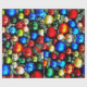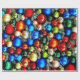 Very pretty Holiday ornaments in blue, red, green, silver and gold rest among Pine Tree branches.