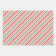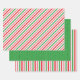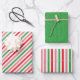 Pretty trio of festive holiday wrap sheets features a vertical stripe in pink, green, red and white, a horizontal stripe in same colours, and a green with green glitter pin stripe.