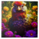 Pretty colourful pink, purple and yellow flower garden with an adorable chicken sitting right in the middle.