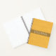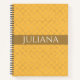 Personalised bullet journal features pretty daffodil yellow background with gold quatrefoil pattern overlay. Customisable text in modern white font