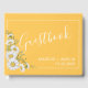 Pretty custom wedding guestbook design features watercolor white daisies corner on daffodil yellow background with white customisable text blocks in modern fonts
