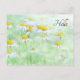 Postcard with a fresh and summery photograph featuring a collection of wild daisies with big yellow centres growing in a green field.