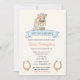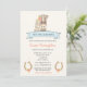 An adorable and sweet filly with a pink rose in its curly mane and blue banner ribbon underneath it with the words "First Place In Our Hearts" is perfect for a Kentucky Derby Baby shower for the mum or parents expecting a baby girl. A sweet filly will be galloping here fast! A pair of horseshoes with a floral accent flanks the bottom of these Kentucky Derby Baby Shower invitations. The back has a pink and white polka dot heart pattern. Artwork © Chrissy H. Studios, LLC. All rights reserved.