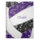 This cute volleyball themed notebook features the realistic image of an abstractly oversized volleyball that has purple, black and white panels with delicate hand-drawn doodle flowers, feathers and paislies in white patterned on the volleyball's purple and black panels - customise with the athlete's name - by katz_d_zynes